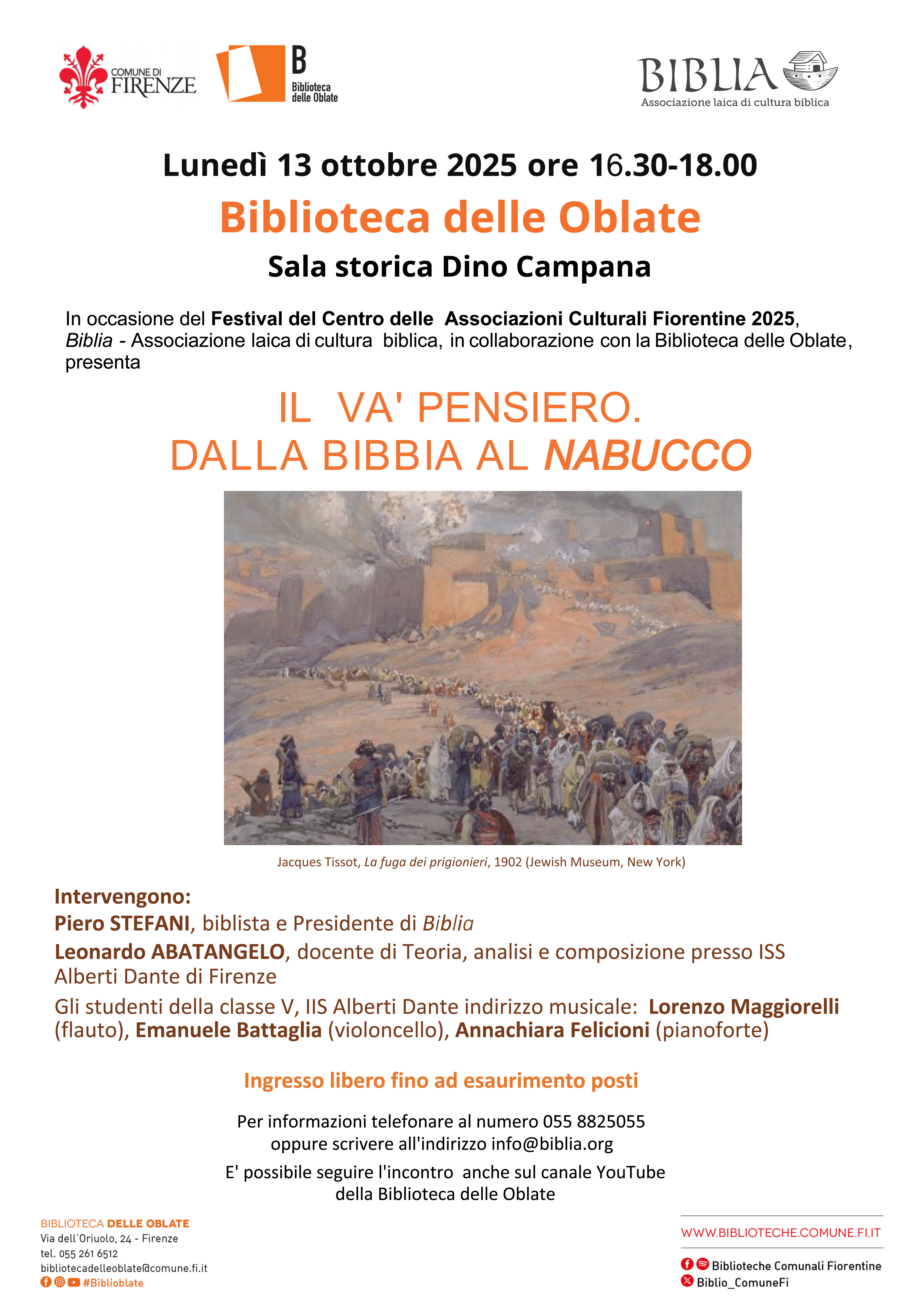 Lunedì 13 ottobre dalle ore 16. 30 alle ore 18.00 presso la Sala storica "Dino Campana" della Biblioteca delle Oblate, l'Istituto Alberti Dante - Polo delle Arti (artistico, classico, musicale) presenterà insieme a Biblia l'evento "Il Va' pensiero. Dalla Bibbia al Nabucco".